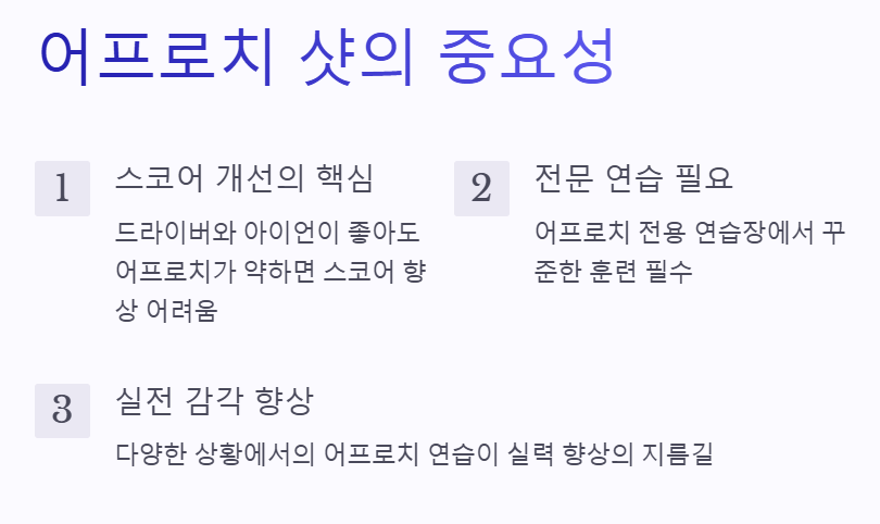 ✔️ 퍼팅과 연계: 어프로치 이후 퍼팅까지의 흐름을 연결해 연습하면 경기력이 향상됩니다.