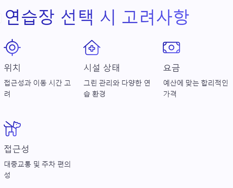 따라서 위치, 시설 상태, 요금, 접근성 등을 종합적으로 고려해 자신에게 맞는 연습장을 선택하는 것이 중요합니다.